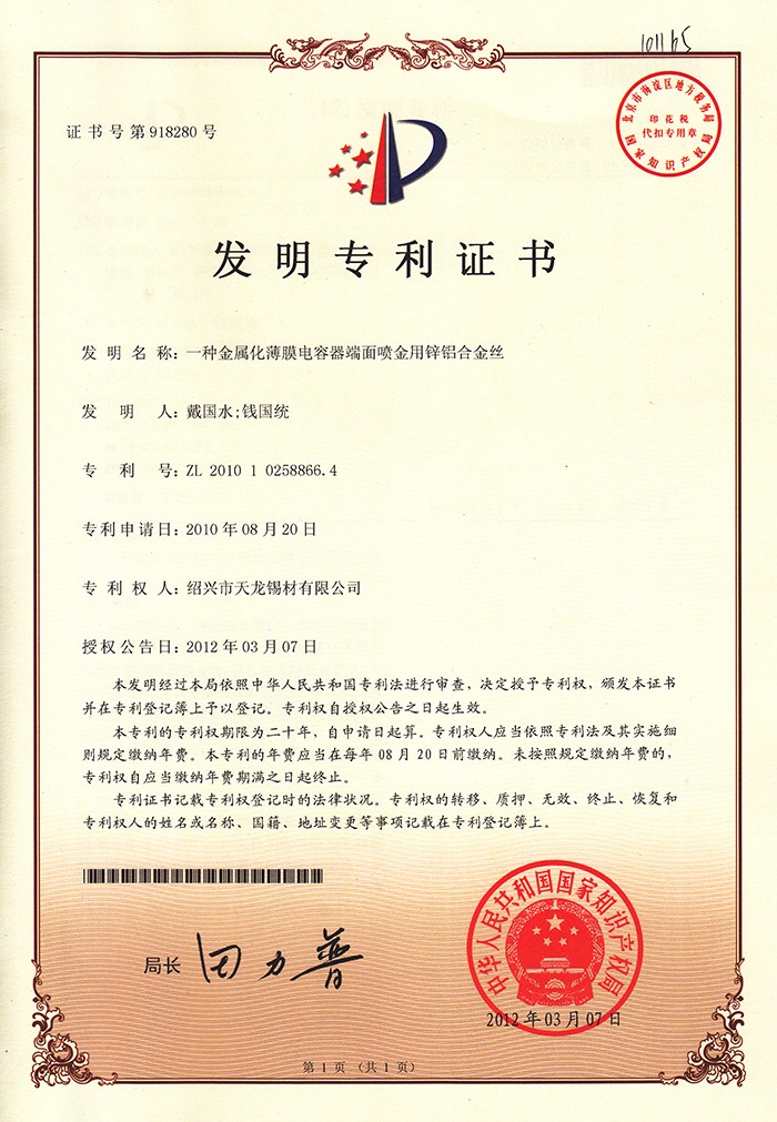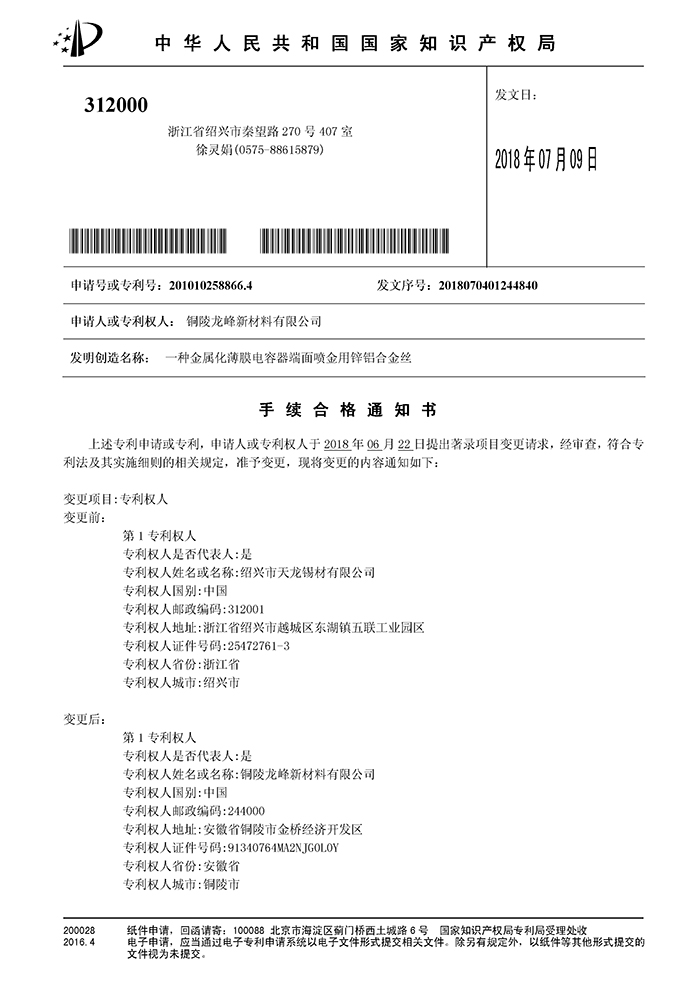 一種金屬化薄膜電容器端面噴金用鋅鋁合金絲專利證書及手續(xù)合格通知書